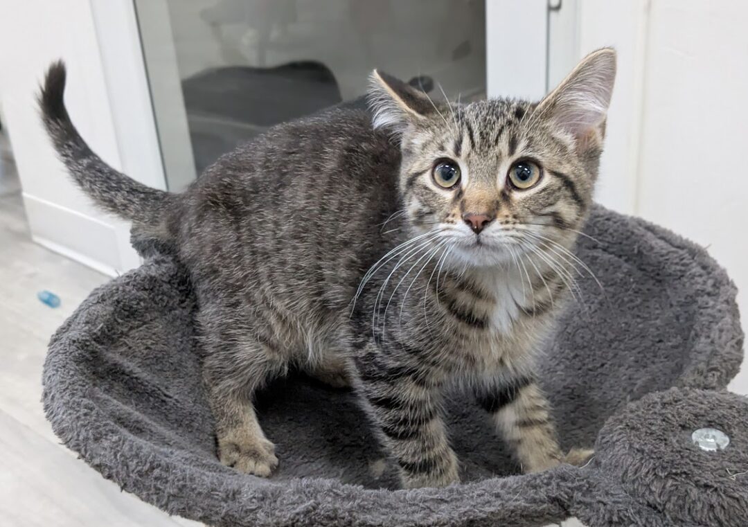 This kitten is social and would prefer to be adopted with another kitten, or have an age-appropriate feline friend at home already.